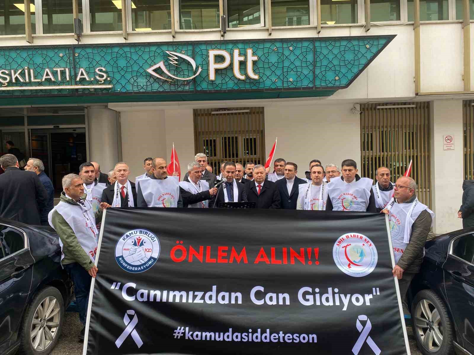 Rize’de PTT Başmüdürlüğü’ne düzenlenen silahlı saldırıda PTT çalışanı Selim Okumuş ve Ömer Bayazıt hayatını kaybetmişti. Hayatını kaybeden 2 çalışan için Adil Haber-Sen tarafından Ankara’da bulunan Posta Telgraf Teşkilatı (PTT) Genel Müdürlüğü önünde eylem yapıldı. Görülmeyeni göstermek, duyulmayanı duyurmak ve konuşulmayanı konuşmak için toplandıklarını belirten Adil Haber-Sen Genel Başkanı Kenan Arık, geçtiğimiz hafta Rize PTT Başmüdürlüğü’nde görev yapan iki mesai arkadaşını kaybetmenin üzüntüsünü yaşadığını belirtti. Arık, “Hayatını kaybeden mesai arkadaşlarımız merhum Selim Okumuş ve merhum Ömer Bayazıt’a Yüce Allah’tan rahmet, kederli aileleri, yakınları ve tüm PTT çalışanlarına başsağlığı ve sabırlar diliyoruz. Bu alçak saldırıyı lanetliyoruz ve saldırıyı gerçekleştiren kişinin ağır en cezayı alması için bizler de davaya müdahil olacağız. Temennimiz odur ki o cani bir daha gün yüzü göremeyecek. Ancak bizlerin de üstüne düşen bazı görevler vardır. Her şeyden önce PTT çalışanlarının değerli olduğunu, sahipsiz olmadığını tüm kamuoyuna duyurmamız gerekmektedir. Bunun için bizler bugün tüm ülkede iş bıraktık ve kamuoyunun dikkatini çekmek istedik. Ama maalesef üzülerek gördük ki olayın yaşandığı Rize’de dahi merhumların cenazesinin kaldırıldığı gün bazı yöneticiler talimat vererek, işlerin aksatılmadan devam ettirilmesi istenmiştir. Bu talimatı kim, neden, nasıl verdi bilmiyoruz. Ama o kişiler de senin kardeşin, oğlun veya baban olabilirdi. Rize’de bir gün PTT çalışmayınca dünyanın sonu değildi” diye konuştu.