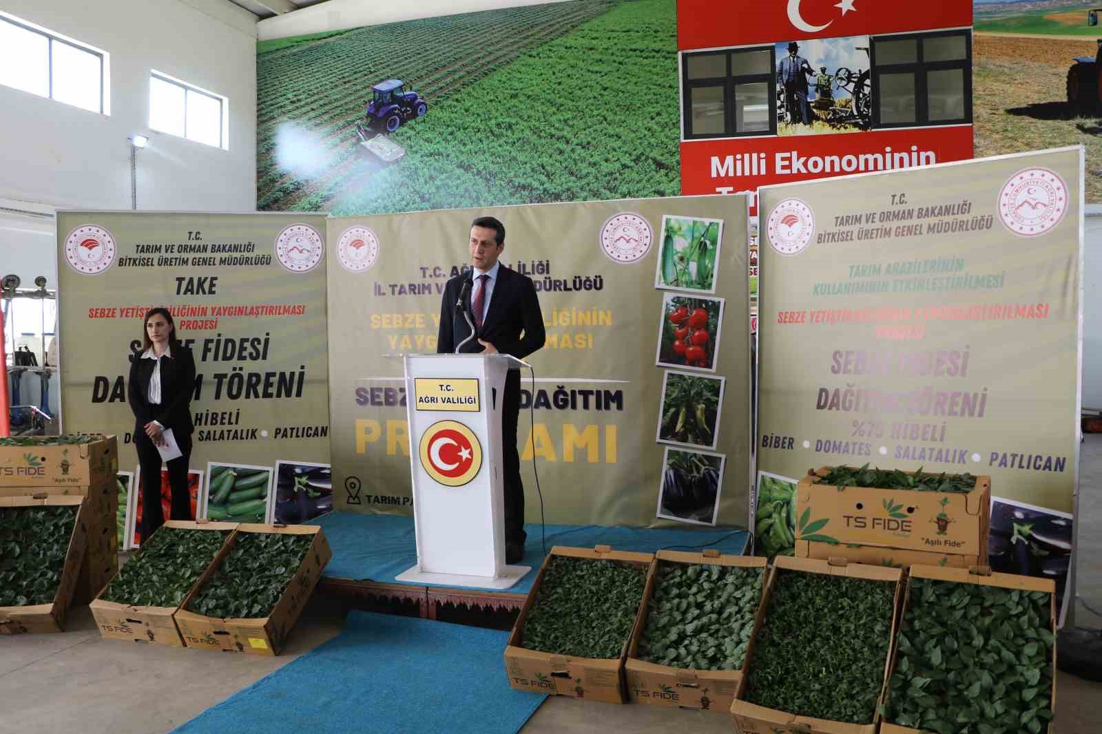 Ağrı’da tarımsal üretimi desteklemek ve sebze yetiştiriciliğini yaygınlaştırmak amacıyla 150 çiftçiye yüzde 75 hibe destekli 147 bin adet sebze fidesi düzenlenen törenle dağıtıldı.