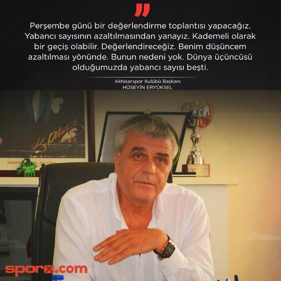 Spor Toto Süper Lig'de yabancı sayısı tartışılırken sayının düşmesi gerektiğini savunan kulüplerden Akhisarspor'da Başkan Hüseyin Eryüksel, konunun basite indirgenmemesini söyledi. Hüseyin Eryüksel, yabancı sayısının kulüplere zarar vermeden kademeli olarak indirilmesi gerek.