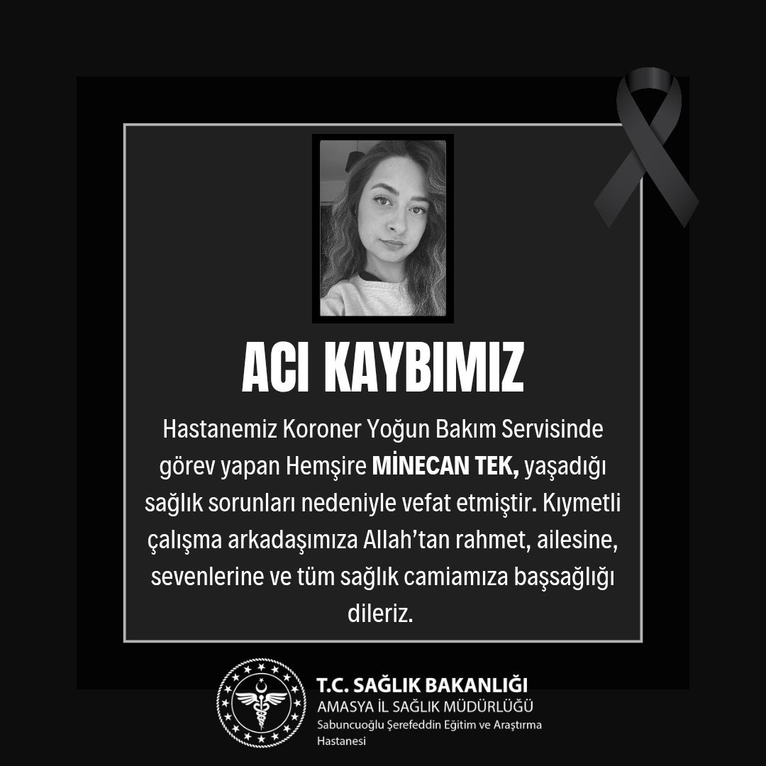 Amasya Üniversitesi Sabuncuoğlu Şerefeddin Eğitim ve Araştırma Hastanesi, 4 yıldır görev yapan genç personelinin vefat haberini, "Hastanemiz koroner yoğun bakım servisinde görev yapan Hemşire Minecan Tek, yaşadığı sağlık sorunları nedeniyle vefat etmiştir. Kıymetli çalışma arkadaşımıza Allah’tan rahmet; ailesine, sevenlerine ve tüm sağlık camiamıza başsağlığı dileriz" notuyla paylaştı.