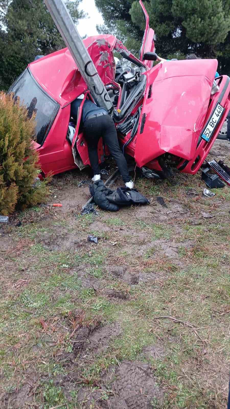 Kaza, Terme ilçesi Sakarlı mevkiinde meydana geldi. Alınan bilgiye göre, Samsun-Ordu karayolunda seyir eden 52 BC 448 plakalı otomobil, yağış nedeniyle kayganlaşan yolda kontrolden çıkarak kavşaktaki aydınlatma direğine çarptı. Adeta ikiye katlanan otomobildeki sürücü K.A. ve S.B. araçta sıkıştı. Olay yerine polis, jandarma, itfaiye ve sağlık ekipleri sevk edildi. İtfaiye ekipleri tarafından sürücü K.A. sıkıştığı yerden çıkartıldıktan sonra Terme Devlet Hastanesi’ne kaldırıldı. Ağır yaralanan S.B. ise, ekiplerin yoğun uğraşlarıyla yaklaşık 1 saatte sıkıştığı yerden çıkarılabildi. S.B. de aynı hastaneye kaldırılarak tedavi altına alındı.