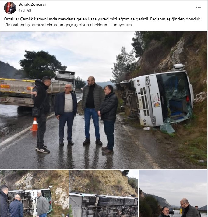 Germencik Belediye Başkanı Burak Zencirci sabah saatlerinde Ortaklar-Çamlık Karayolu’nda festivale giden yolcuları taşıyan minibüsün devrilmesi sonucu 23 kişinin yaralandığı kaza sonrası olay yerinde incelemelerde bulunurken, sosyal medya hesabından yaptığı paylaşımla yaralılara geçmiş olsun dileklerini iletti.