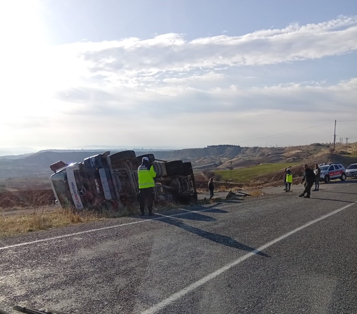 Adıyaman’da, sürücüsünün direksiyon hakimiyetin kaybettiği beton mikseri devrildi.