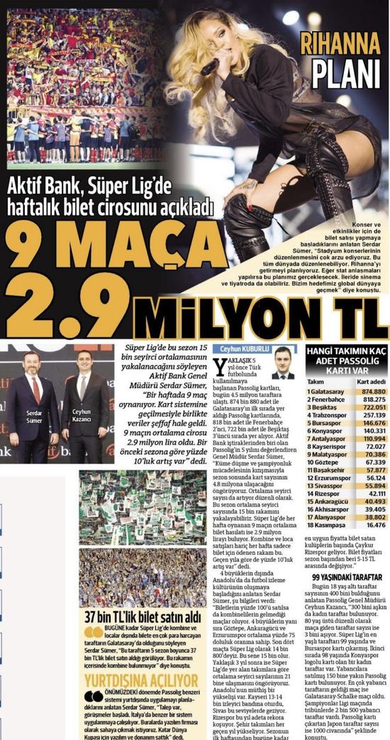 Yaklaşık 5 yıl önce Türk futbolunda kullanılmaya başlanan Passolig kartları, bugün 4.5 milyon taraftara ulaştı. 874 bin 880 adet ile Galatasaray'ın ilk sırada yer aldığı Passolig kartlarında, 818 bin adet ile Fenerbahçe 2'nci, 722 bin adet ile Beşiktaş 3'üncü sırada yer alıyor. Aktif Bank iştiraklerinden biri olan Passolig'in 5 yılını değerlendiren Genel Müdür Serdar Sümer, "Küme düşme ve şampiyonluk mücadelesinin kızışmasıyla sezon sonunda kart sayısının 4.8 milyona ulaşacağını öngörüyoruz. Ortalama seyirci sayısı da artıyor düzenli olarak. Bu sezon ortalama seyirci sayısında 15 bin rakamını yakalayabiliriz. Süper Lig'de her hafta oynanan 9 maçın ortalama bilet hasılatı ise 2.9 milyon lirayı buluyor. Kombine ve loca satışları hariç her hafta sadece bilet için ödenen rakam bu. Geçen yıla göre de yüzde 10'luk artış var" dedi.