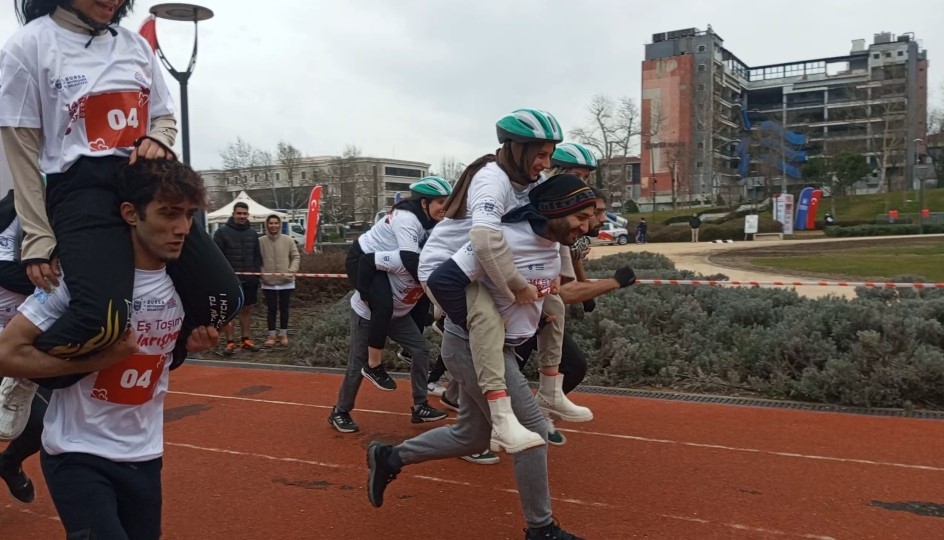Bursa Büyükşehir Belediyesi’nin hazırladığı, Bursa Millet Bahçesi’nde gerçekleşen eş taşıma yarışması düzenlendi. Birçok çiftin katıldığı yarışmada renkli anlar kameralara yansıdı. Zorlu parkurların olduğu yarışmada eşler kıyasıya rekabet ederken yere düşen çiftler ise pes etmeden yerden kalkarak 1’inci olmak için yarıştı. Eşlerini sırtına alan çiftler kıyasıya rekabet etti. Yaş kategorilerinin olduğu yarışmaya gencinden yaşlısına herkes katılarak, yağmur çamur dinlemeden keyifle yarıştı. Yarışmada kazanan çiftlere Burfaş’ta yemek çeki ve birçok ödül takdim edildi. Yarışmayı kazanan ve yarışmaya katılanlar birlikte toplu hatıra fotoğrafı çekildi.