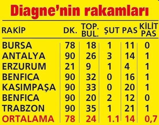 Diagne 7 maçta ortalama 24 kez topla buluşabilirken, sadece 14 pas attı. Yıldız futbolcu bu karşılaşmalarda ortalama 1.1 şut çekebilirken, 0.7 kilit pas attı. Bu rakamlar kaleci Muslera'nın bile gerisinde kaldı.