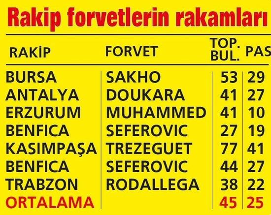 3-2 yenilen Bursa'nın da 5-0 kaybeden Antalya'nın da forvetleri Diagne'den etkili oldu. G.Saray karşısında 2-0 öne geçmesine rağmen 3-2 kaybeden Bursaspor'un forveti Diafra Sakho 1 gol atarken, 53 kez topla buluşup 29 pas verdi. İki hafta önce Galatasaray'a 5-0 yenilen Antalya'nın forveti Doukara ise 41 kez topla buluşup 27 pas verdi. Diagne son Bursa maçında sadece 18 kez topa dokunabildi.