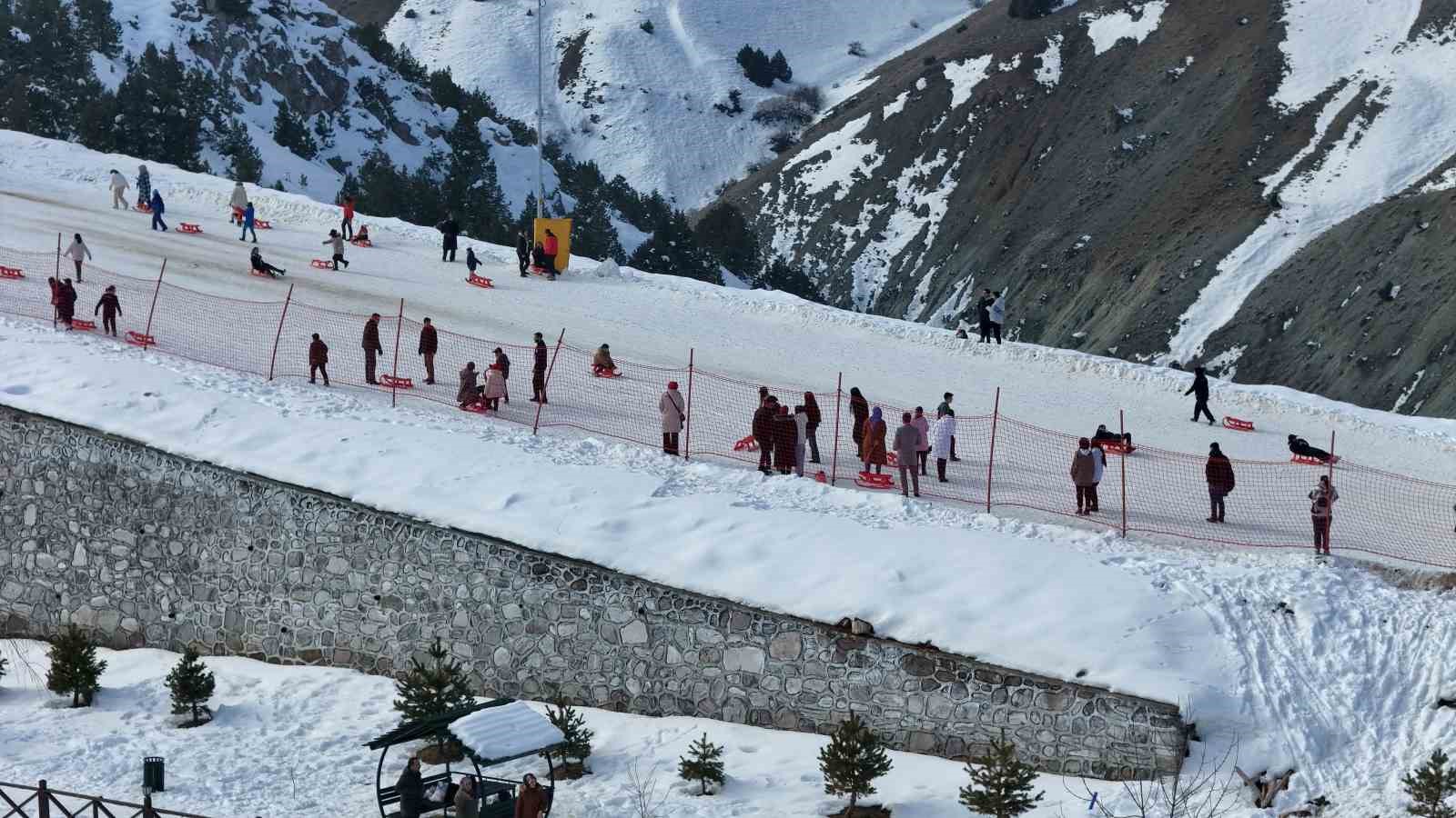 Ergan’da kayakçılar kayak keyfi yaşıyor. Kayak yapmayanlar ise aileleriyle birlikte Ardıçlı gölü manzarasının tadını çıkardı.