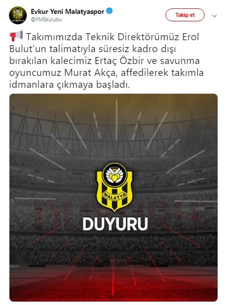 "Takımımızda Teknik Direktörümüz Erol Bulut'un talimatıyla süresiz kadro dışı bırakılan kalecimiz Ertaç Özbir ve savunma oyuncumuz Murat Akça, affedilerek takımla idmanlara çıkmaya başladı."