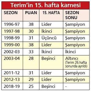 Fatih Terim'in sarı-kırmızılı takımın başında 9 ayrı sezondaki 15 haftalık karnesi incelendiğinde bu sezon topladığı 25 puan en düşüğü olarak dikkat çekiyor.