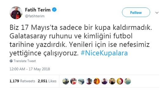 Günün ilk dakikasında paylaşımı yapan Fatih Terim, "Biz 17 Mayıs'ta sadece bir kupa kaldırmadık. Galatasaray ruhunu ve kimliğini futbol tarihine yazdırdık. Yenileri için ise nefesimiz yettiğince çalışıyoruz. Nice kupalara." ifadelerini kullandı.