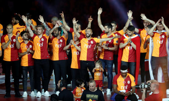Galatasaray şampiyonluk kutlamaları devam ederken, futbolcular, teknik heyet ve teknik direktör Fatih Terim, belirledikleri şarkılarla sahaya çıkarak taraftarı selamladı.