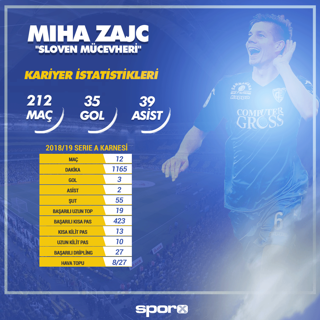 2022 yılına kadar Empoli ile sözleşmesi bulunan Miha Zajc bu sezon Serie A'da 20 maçta 3 gol, 3 asistlik performans sergiledi.