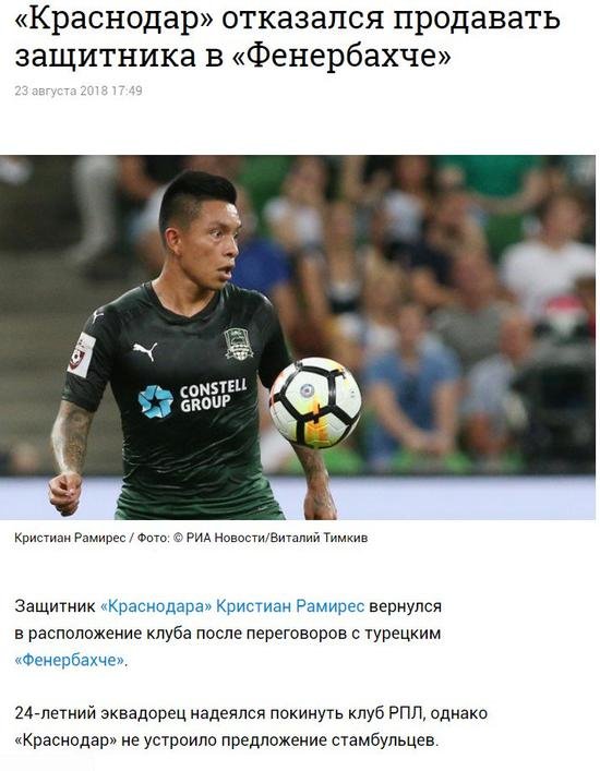 Rusya basınından Sport-Express'te yer alan habere göre; Krasnodar, İstanbul'a kadar giden Cristian Ramirez için Fenerbahçe'nin yaptığı teklifi beğenmedi ve transfer bu nedenle yattı.