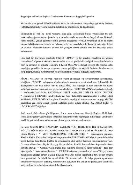 FİKRET ORMAN'ın röportajı maalesef bizim ailemizden ve dostlarımızdan gördüğümüz, bildiğimiz"SEVGİ" anlayışının oldukça dışında kavramları hedef almaktadır. Bilinmelidir ki: Sözleşmemde yer alan miktarı her ay almak FIFA'nın koyduğu ve tüm dünyada her futbol kulübünde yer alan oyuncular için geçerli olan bir haktır. FİKRET ORMAN'ın röportajda söylediği " OYNAMADAN PARA KAZANMAK İSTEDİ. NAPALIM ? BİZ DE SAYGI DUYDUK " cümlesi bir İFTİRADIR. Şimdiye kadar adı hiçbir haksızlıkta geçmemiş olan Beşiktaş Futbol Kulübünün, FİKRET ORMAN'ın görev döneminde yaşadığı sıkıntıları ve adının karıştığı MADDİ skandalları göz önüne alacak olursak sarf ettiği cümle kulağa oldukça RAHATSIZ EDİCİ ve UMURSAMAZCA geliyor.