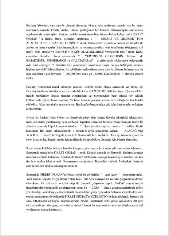Beşiktaş Yönetimi, yan transfer dönemi bitmesin 48 saat kala tarafımıza transfer için bir takım aramam.' söyledi. Elbette aradık. Bunun profesyonel bir transfer olamayacağını size önceki açıklamamda belirtmiştim. Yurt dışı da dahil olmak üzere beni isteyen birkaç kulüp ismini FİKRET ORMAN'a ilettik Buna istinaden tarafımıza " GEÇMİŞ VE GELECEK TÜM ALACAKLARINI BIRAKSIN; GİTSİN " dendi. Bunu benim dışımda o dönem adı transfer ile anılan her isme yaptılar. Beni istemedikleri ve oynatmayacakları için kendilerine sözleşmeyi çift taraflı fesih etmeyi ve SADECE GEÇMİŞ ALACAKLARIMI vermelerini teklif ettim. Kabul etmediler Kendileri bana sonrasında " YURT DIŞINA GİDECEKSİN. Türkiye'de BAŞAKŞEHİR, FENERBAHÇE ve GALATASARAY'a gidemezsin sözleşmeye ekleyeceğiz öyle fesih edeceğiz. " tehdidini bile çekinmeden savurdular. Böyle bir şey helal para kazanan hiç kimseye teklif dahi edilemez. Bu tekliflerini reddettikten sonra transfer dönemi bitimine son bir gün kala bana o gün boyunca " 300.000 Euro bırak git , 200.000 Euro bırak git " demeye devam ettiler.