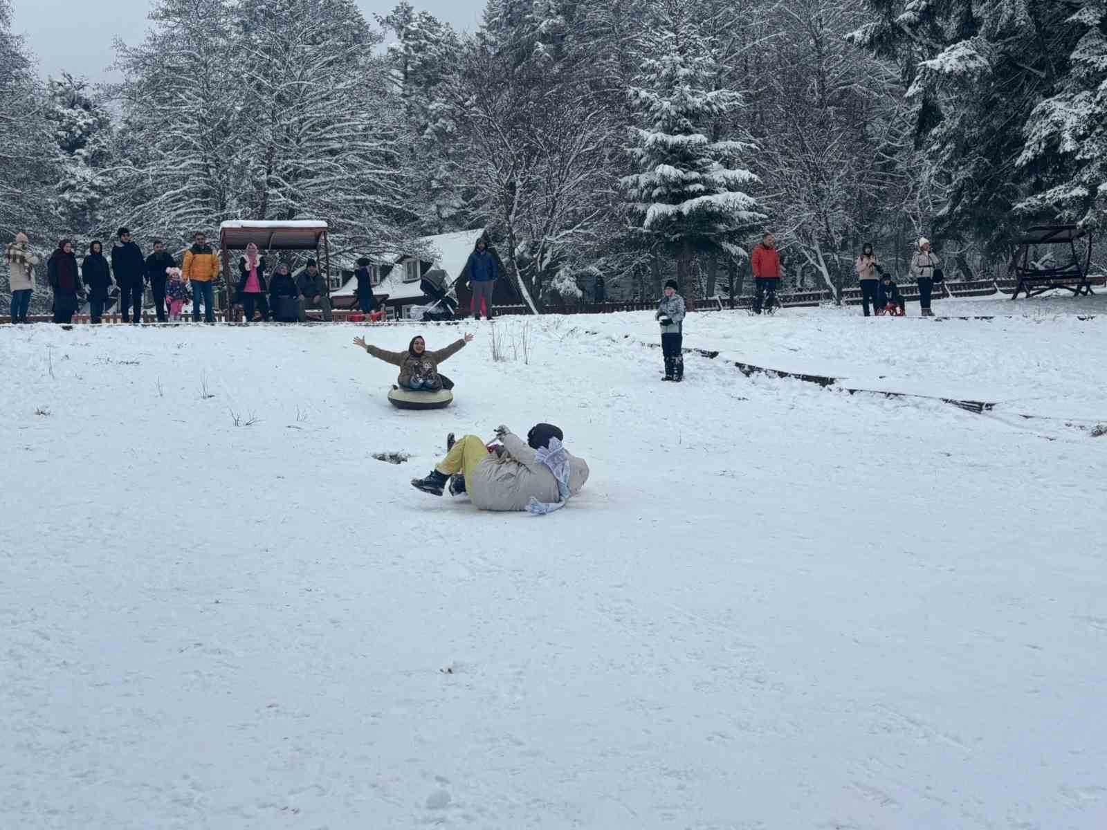 Kent merkezine 13 kilometre uzaklıkta bulunan Bolu’nun incisi olarak tabir edilen Gölcük Tabiat Parkı, hafta sonu tatilinde ziyaretçilerle doldu. Geçtiğimiz 3 gün boyunca aralıklarla kar yağışının etkili olduğu tabiat parkında kar kalınlığı 10 santimetreye ulaştı. Göl kıyısında bulunan rampada tabiat parkına gelen tatilciler tarafından kayak pisti oluşturuldu. Şambrellerini eline alan tatilciler, Gölcük’ün yolunu tuttu. Eğlenceleri anlar yaşayan tatilciler, şambrellerle kayarak tatilin tadını çıkarttı.