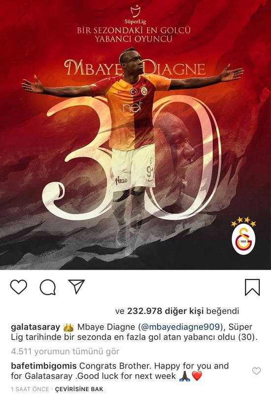 29 golle geçen sezon Süper Lig'in en fazla gol atan yabancı oyuncusu rekorunu kıran Galatasaray'ın eski golcüsü Bafetimbi Gomis, 30 golle rekorunu geliştiren Mbaye Diagne'yi sosyal medya hesaplarından tebrik etti.