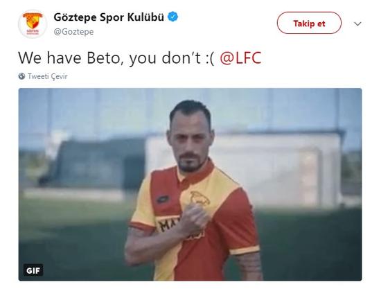 Göztepe, Twitter hesabından hatalı goller yiyen Liverpool'un kalecisi Loris Karius'a gönderme yaparak Liverpool'u etiketleyerek ''Biz Beto'ya sahibiz, siz değilsiniz :('' paylaşımı yaptı.