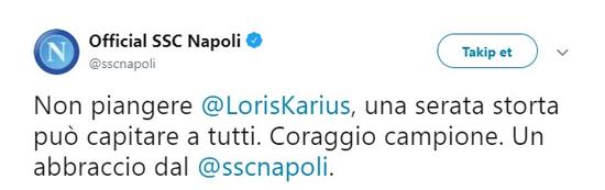 Öte yandan İtalyan Napoli takımı, Twitter hesabından yaptığı paylaşımda ''Ağlama Loris Karius. Herkes için kötü geceler olabilir. Cesaretlen. Seni kucaklıyoruz'' sözlerini kullandı.