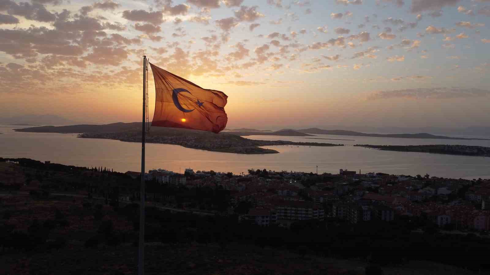 Gün batımında Türk bayrağı ve Ayvalık adaları görsel şölen oluşturdu