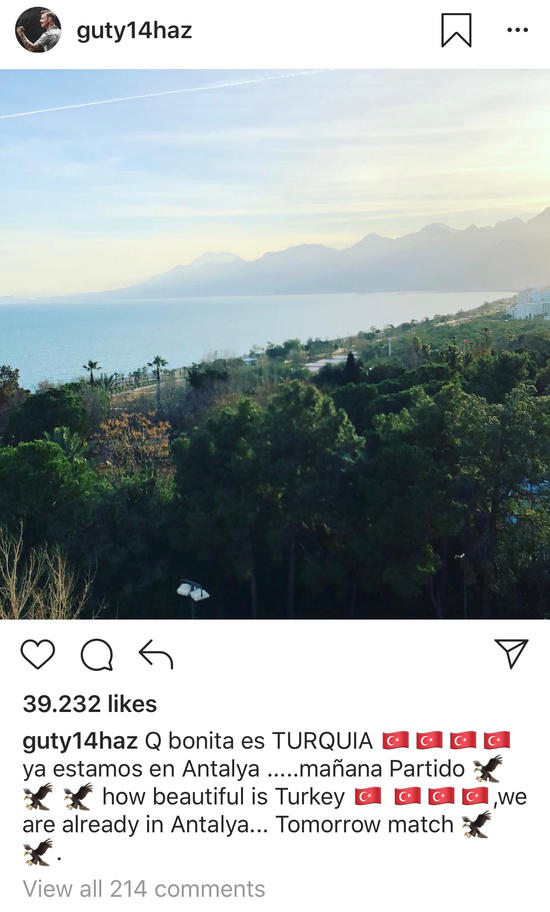Instagram'da 619 bin takipçisi bulunan İspanyol Guti Hernandez paylaşımında, "Ne kadar da güzelsin Türkiye. Biz Antalya'dayız. Yarın maçımız var" sözleriyle yaptığı paylaşımı 39 bin kişi beğenirken, yüzlerce de yorum aldı.