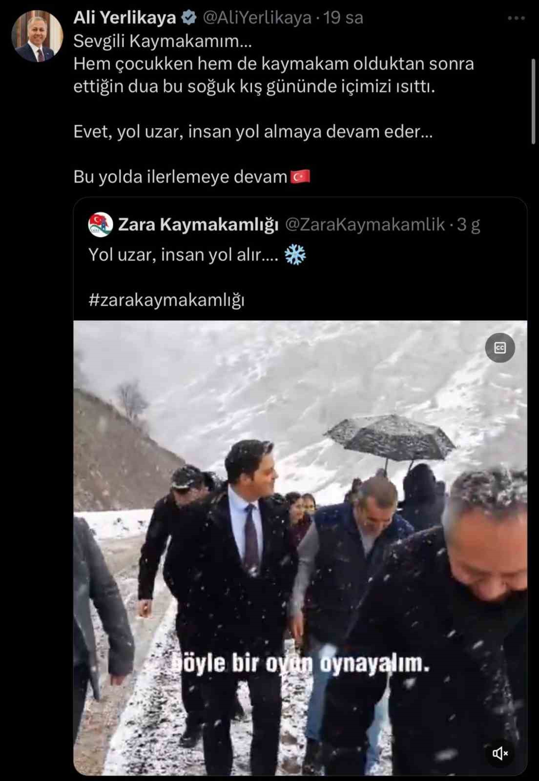 Kaymakamın yürek ısıtan videosunu paylaşan İçişleri Bakanı Ali Yerlikaya, "Sevgili Kaymakamım hem çocukken hem de kaymakam olduktan sonra ettiğin dua bu soğuk kış gününde içimizi ısıttı" ifadelerine yer verdi.