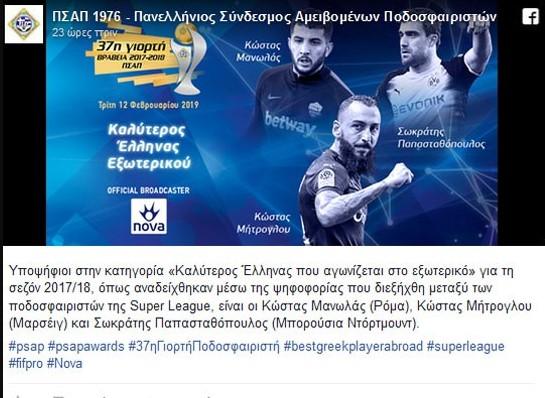 'En iyi futbolcu' kategorisinde Galatasaray'a transfer olan Kostas Mitroglou da yer alıyor. Bu kategoride yer alan diğer iki aday ise Roma'da forma giyen Kostas Manolas ve Arsenal'de oynayan Sokratis Papastathopoulos oldu.