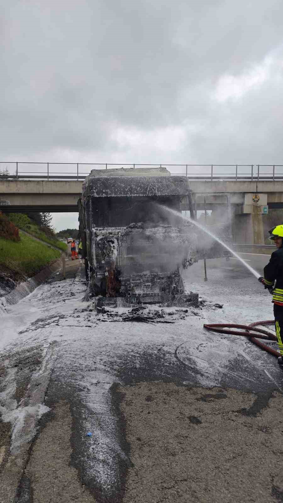 Bolu’da otoyolda seyir halindeyken tekerleği patlayan tır alev aldı. Alevlere teslim olan tır küle döndü.