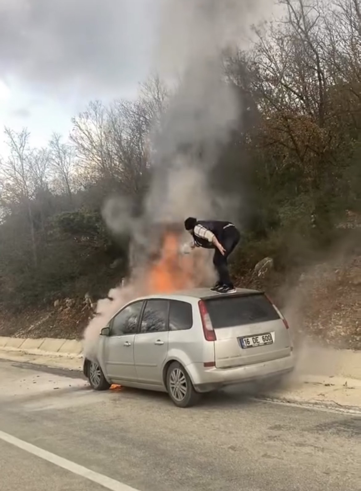Osmangazi ilçesinde seyir halindeki araç, motor kısmından alev aldı. Durumu fark eden sürücü aracını emniyet şeridine çekti. Çevredekiler yangın tüpü ararken, sürücü canını hiçe sayıp aracın tavanına çıkarak bir şişe suyu alevlerin üzerine döktü. O anlar kameraya yansırken, itfaiye ekiplerinin söndürdüğü araç kullanılamaz hale geldi. Olayla ilgili tahkikat başlatıldı.