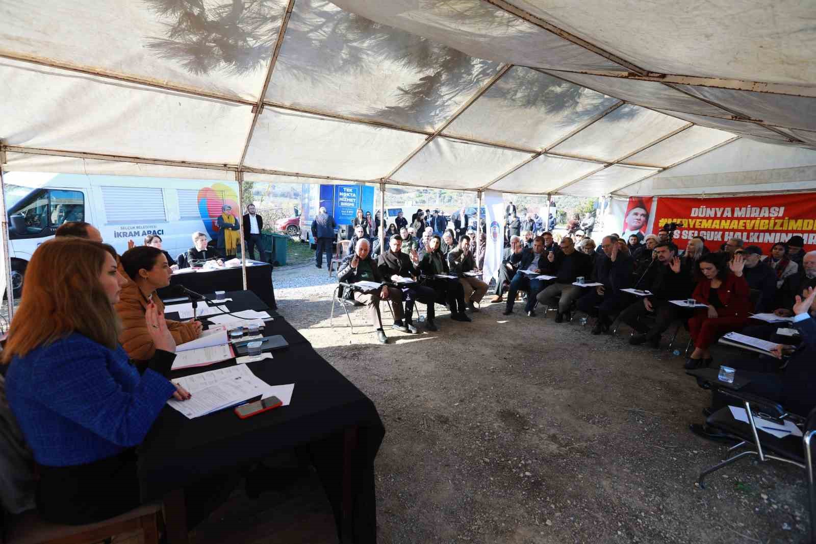 Selçuk Belediye Meclisinin 2025 yılı ilk toplantısı, Meryem Ana Tabiat Parkı ziyaretçi otoparkı nöbet alanında yapıldı. Belediye Başkanı Filiz Ceritoğlu Sengel, Meryem Ana Evi otopark gelirlerinin Selçuk’ta kalması ve bu amaçla devam eden nöbete destek veren herkese teşekkür etti.