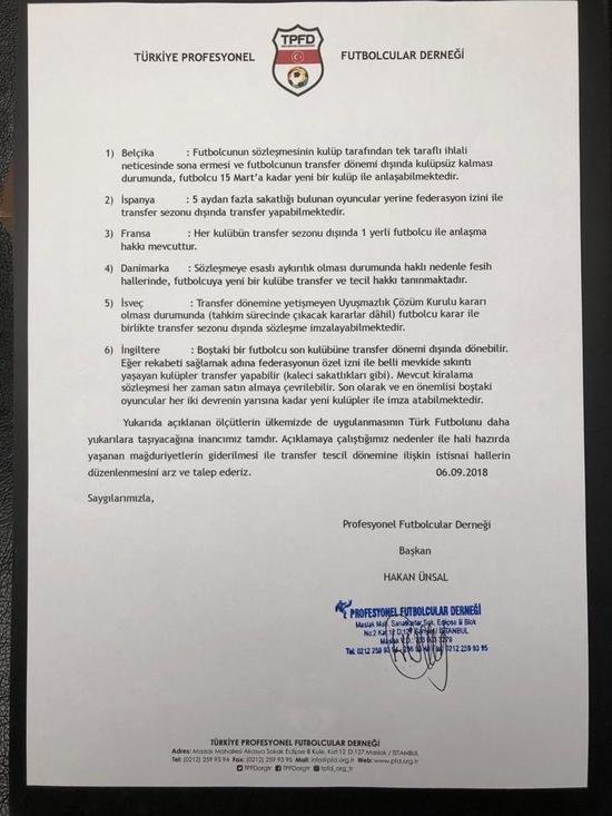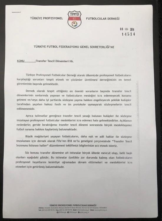 Fifa'nın 818 nolu genelgesine istinaden 'Transfer Tescil Sezonuna İstisnai düzenlemeler yapılabileceği kanaatindeyiz. Talimatlarda gerçekleştirilecek bir değişiklik ile sorunun çözülebileceğini ayrıca geride bıraktığımız tescil dönemine ilişkin olarak Türkiye Futbol Federasyonu'nun idari tasarrufu ile lisans çıkarılamadığı için futbol oynama hakkı elde edemeyen futbolculara transfer tescil hakkının mümkün olacağını düşünüyoruz.