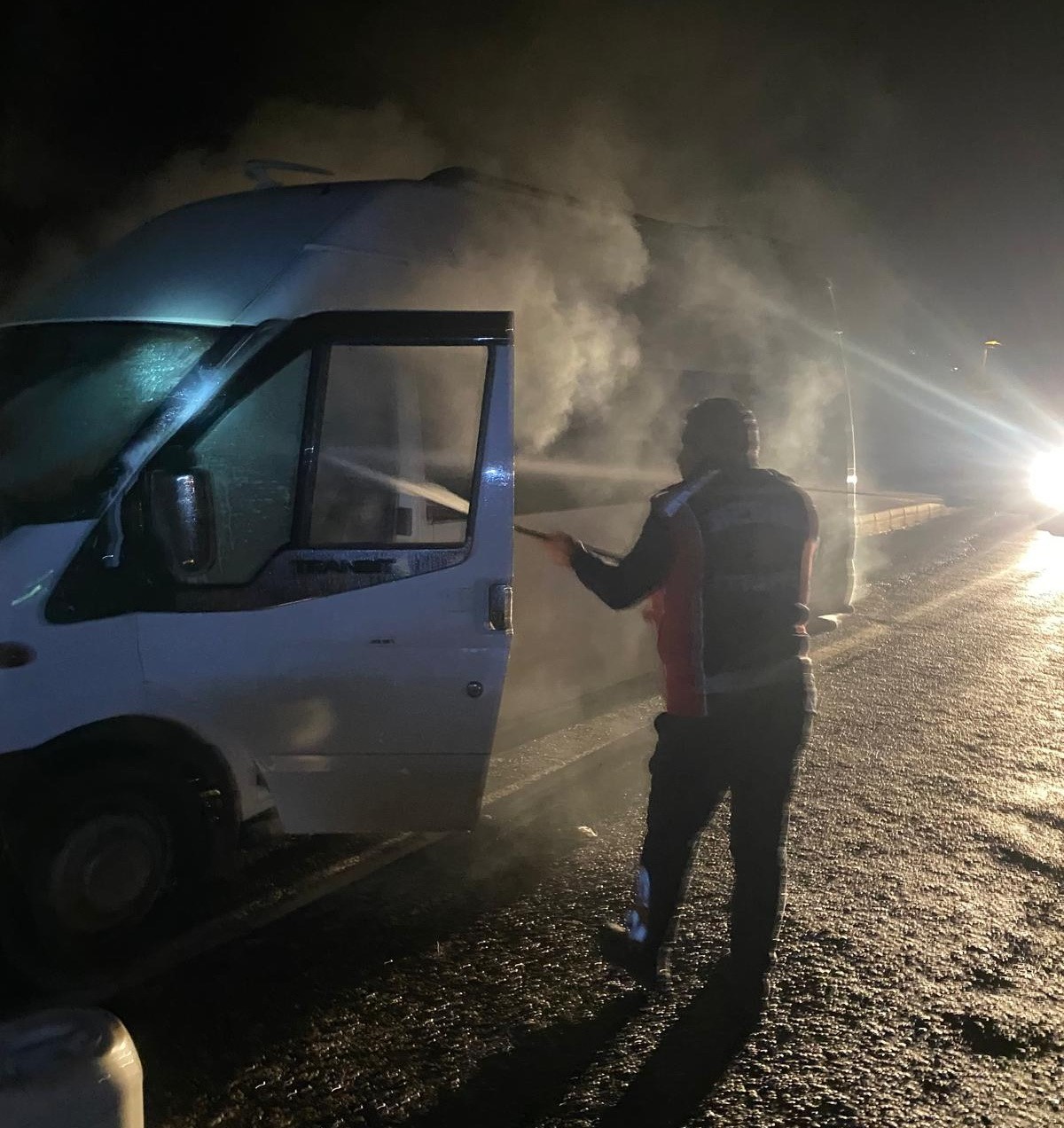 Seyir halindeki minibüs alev aldı
