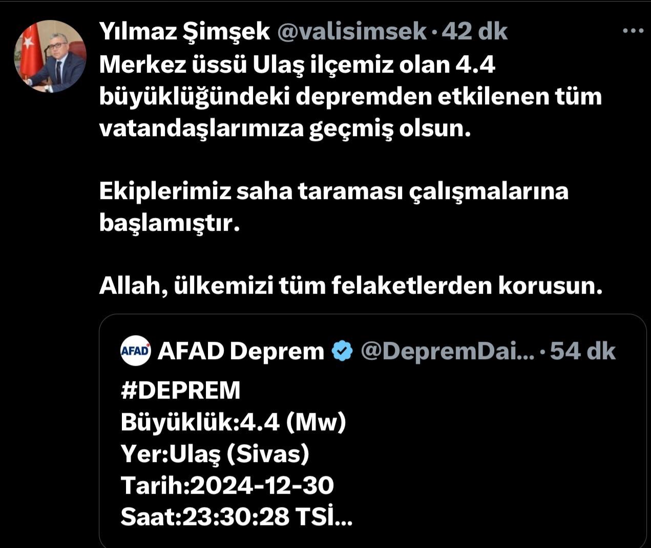 Sivas Ulaş’ta 4,4 büyüklüğünde deprem: Hasar tespit edilmedi