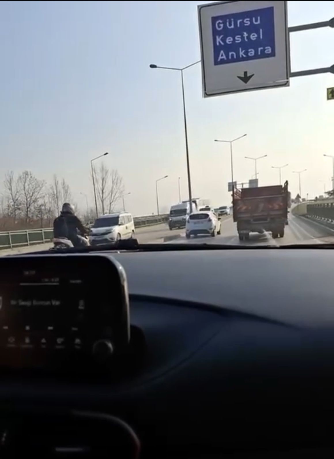 Bursa’da seyir halindeki otomobilde bulunan bir vatandaş, sosyal medya için görüntü çekmeye başladı. Telefonuyla kayda giren vatandaş, bir motosikletlinin kaza anını kayıt altına aldı. Kaza anı saniye saniye kaydedildi.