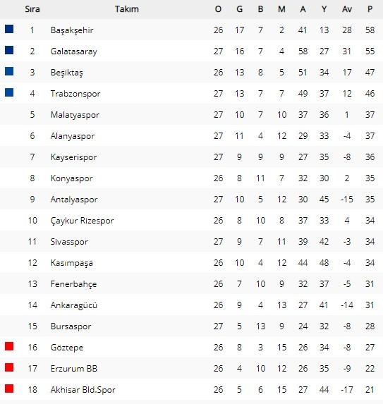 Süper Lig Puan Durumu (27. Hafta)