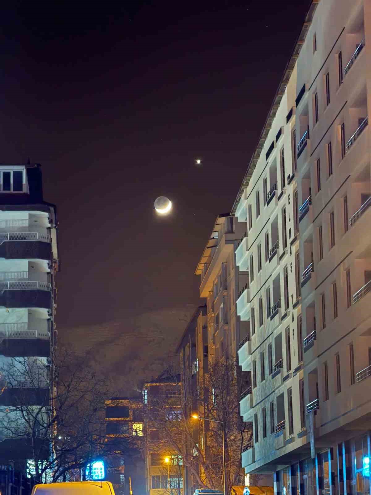 Bitlis’in Tatvan ilçesinde hilal şeklindeki ay ile yıldız gökyüzünde buluştu.