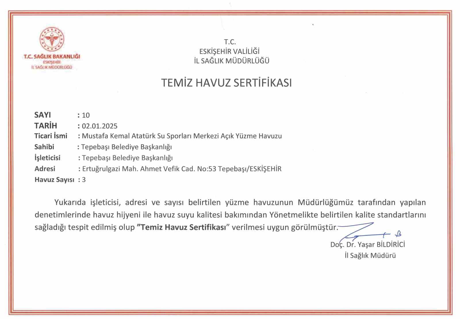 Tepebaşı Belediyesi’nin uluslararası Leeds sertifikalı çevreci binası Mustafa Kemal Atatürk Spor Tesisleri Su Sporları Merkezi, havuz suyu hijyeni ve havuz suyu kalitesi bakımından “Temiz Havuz Sertifikası” aldı.