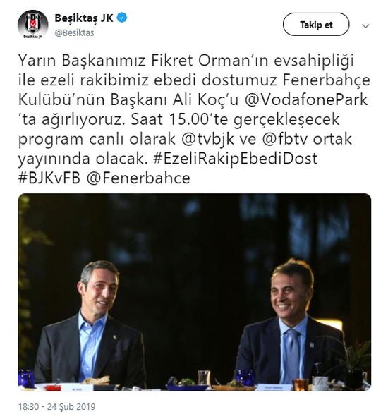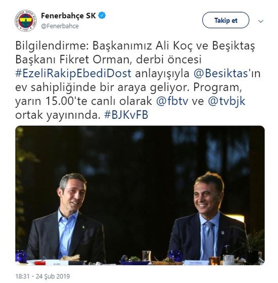 Beşiktaş ve Fenerbahçe kulüplerinden yapılan açıklamada, Fikret Orman ve Ali Koç'un saat 15.00'te BJKTV ve FBTV ve ortak yayınlanacak pprograma beraber çıkacakları duyuruldu.