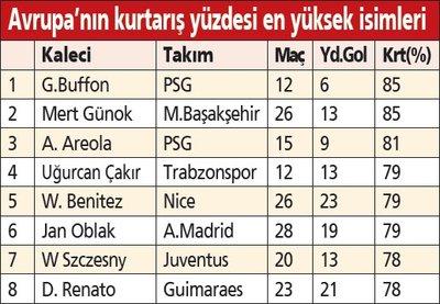 Bu sezon yüzde 79'luk bir kurtarış değeriyle yoluna devam eden Çakır, 8 büyük ligde en az 10 maça çıkmış kaleciler arasında 4. sıraya yerleşti. İlk sırasında Mert Günok ve PSG'den Gianluigi Buffon'un yüzde 85'lik değerleriyle yer aldığı tablonun, üçüncü sırasında ise Opta verilerine göre; yine PSG'de forma giyen Areola (yüzde 81) yer alıyor.