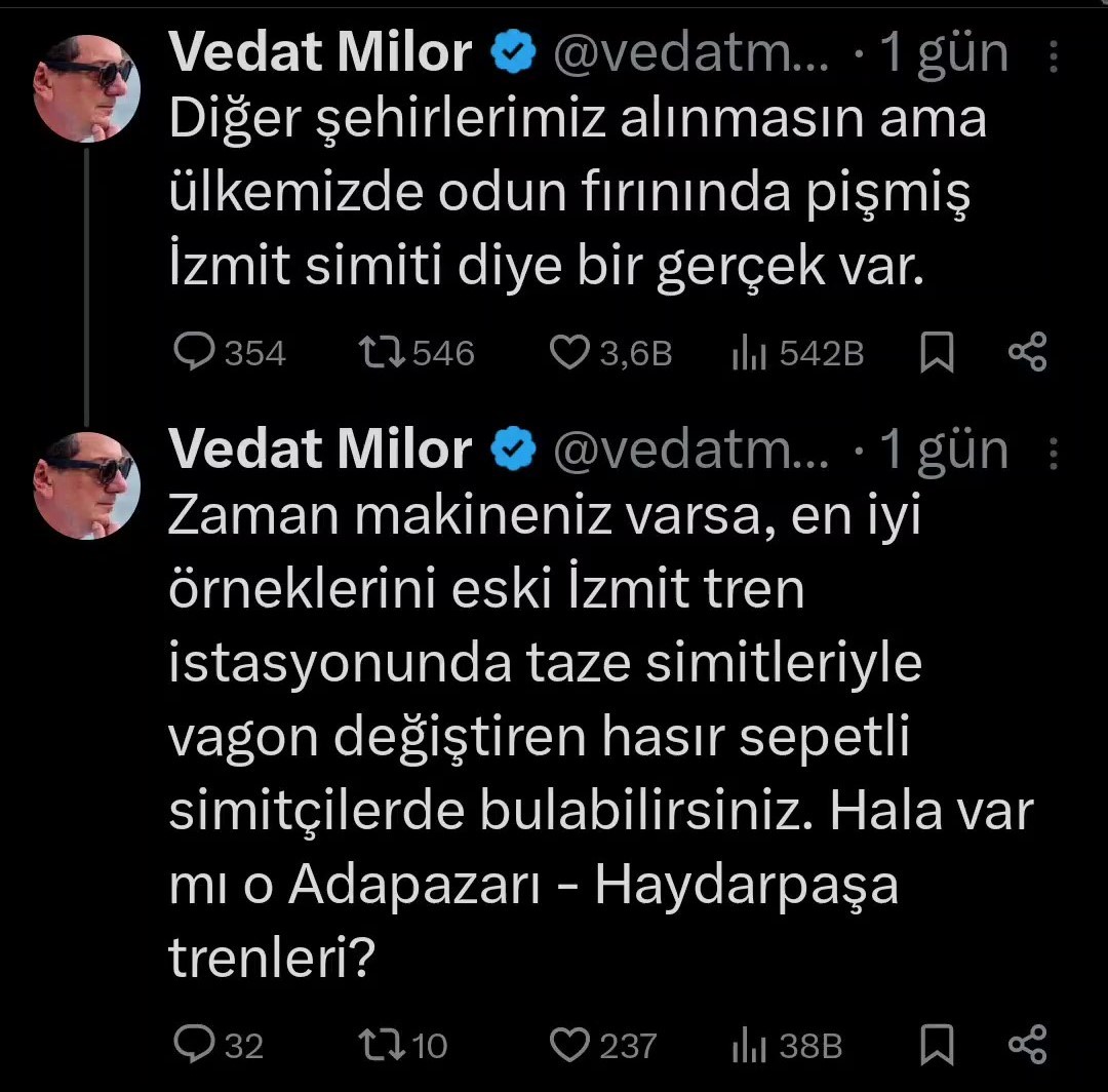 Vedat Milor, tartışmaların ardından nostaljik bir anısını da paylaştı. Milor, "En iyi örneklerini eski İzmit tren istasyonunda taze simitleriyle vagon değiştiren hasır sepetli simitçilerde bulabilirsiniz. Hâlâ var mı o Adapazarı - Haydarpaşa trenleri?" sözleriyle İzmit simidinin geçmişine vurgu yaptı.