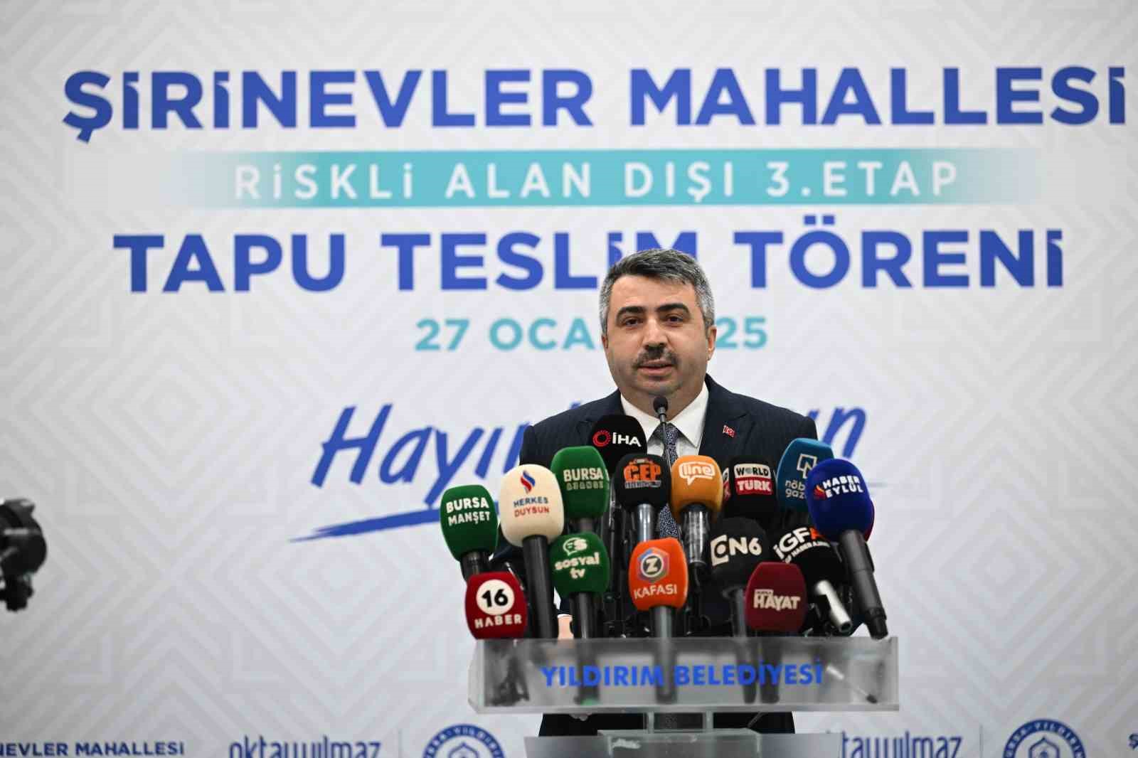 Naim Süleymanoğlu Spor Kompleksi’nde düzenlenen Şirinevler Mahallesi 3. Etap Tapu Teslim Töreni’ne Yıldırım Belediye Başkanı Oktay Yılmaz, Büyükşehir Belediyesi Başkan Vekili Recep Çohan, AK Parti İl Başkan Vekili Cem Kürşad Hasanoğlu, AK Parti İlçe Başkanı İrfan Akkaya ve vatandaşlar katıldı.